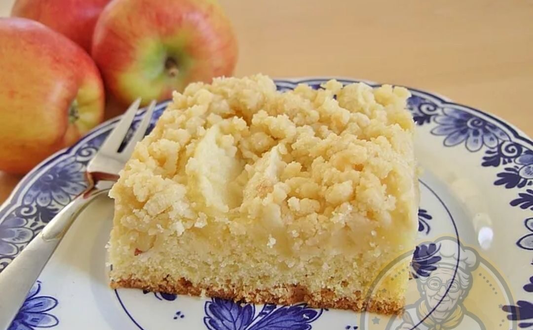 4- Für die Streusel Butter, Zucker, Vanillezucker und Mehl verkneten, zu groben Bröseln formen und gleichmäßig über die Äpfel streuen.
