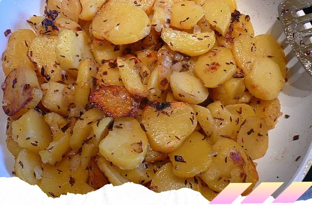 Die geschälten Kartoffeln in hauchdünne Scheiben schneiden und in eine erhitzte große Bratpfanne mit Öl geben. Die gehackte Zwiebel dazugeben und mit Kümmel (ganz oder gemahlen), Salz, Pfeffer und Paprikapulver würzen.