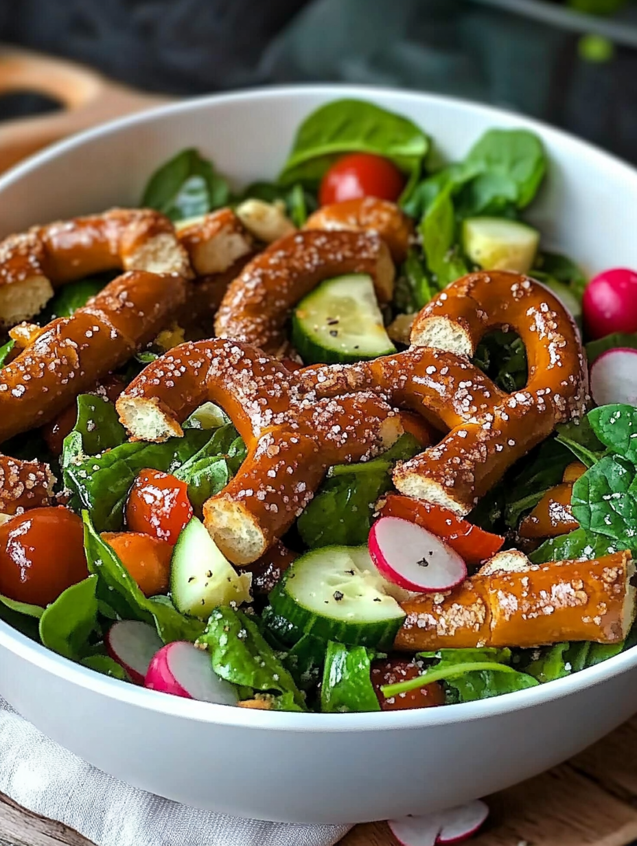 Die Brezelstücke nehmen das Dressing leicht auf und sorgen für ein intensives Aroma. Gleichzeitig bringen Zutaten wie Radieschen, Gurken und Tomaten eine frische, knackige Komponente ins Spiel.