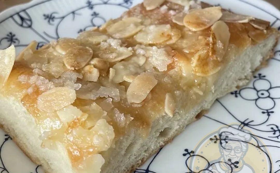 9- Die Mandelblättchen, Puderzucker, Zucker und Butterflöckchen gleichmäßig auf dem Teig verteilen.
