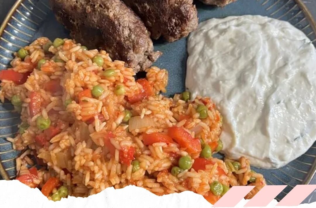 Die Cevapcici mit dem Djuvecreis und dem Tzatziki servieren. Dazu passt Fladenbrot.