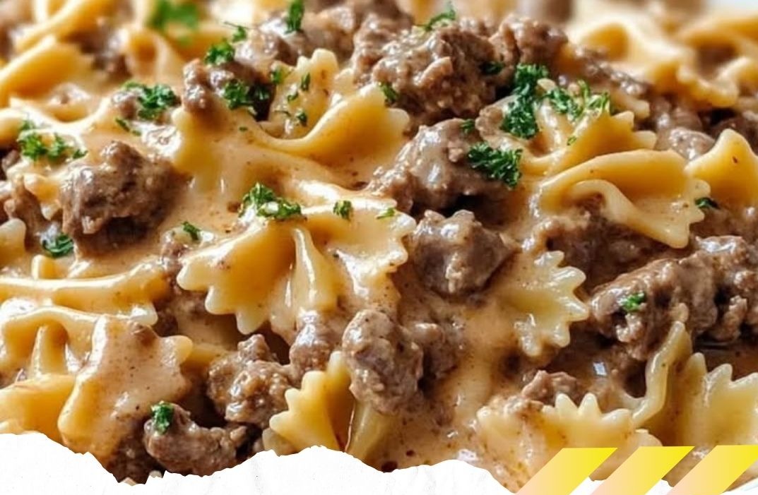 5- Gib die ungekochte Farfalle, Rinderbrühe, Sahne und italienische Kräuter in die Pfanne. Rühre alles gut um.