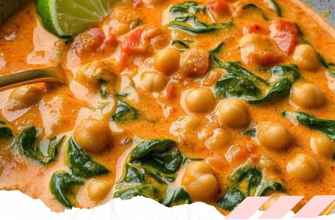 Kichererbsen, gehackte Tomaten, Kokosmilch, Spinat und alle Gewürze hinzufügen. Alles für 10 Minuten köcheln lassen und gelegentlich umrühren.