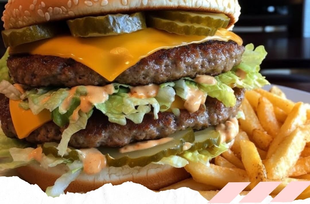 Die unterste Schicht Brötchen mit der Big-Mac-Soße bestreichen. Etwas gewürfelte Zwiebeln, Salatstreifen und 2 Gurkenscheiben darauflegen. Ein Patty und eine Scheibe Käse daraufsetzen.