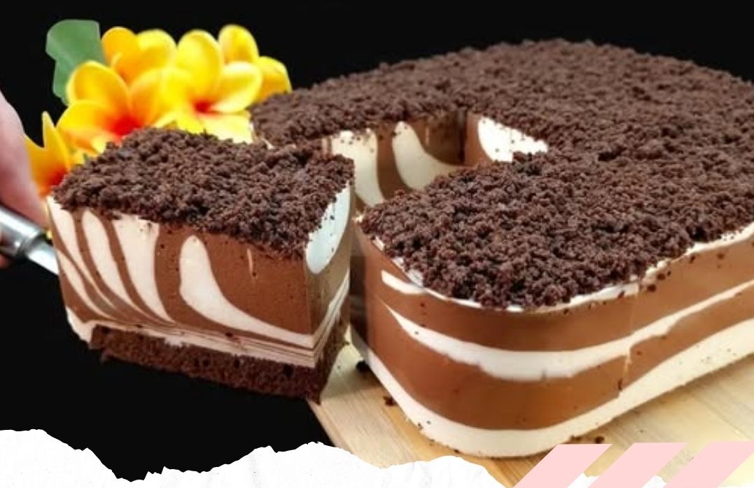 16- Abwechselnd eine Tasse weiße und eine Tasse Schokoladencreme auf den Kuchen geben.