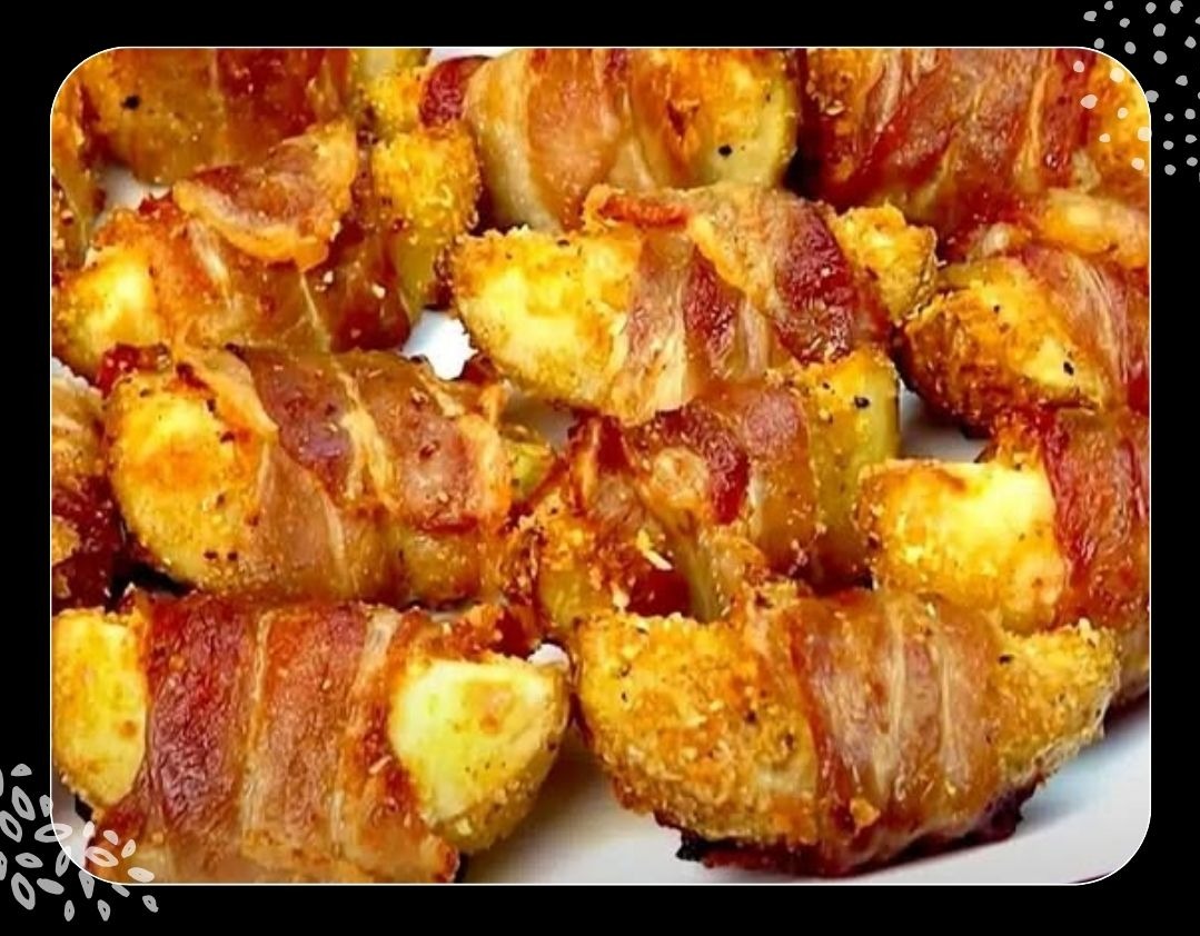 4- Jede Kartoffelspalte mit einer Speckscheibe umwickeln.