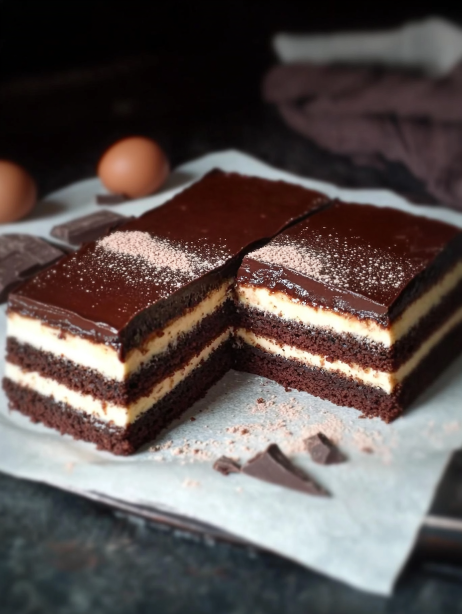 Das Ergebnis ist ein saftiger Schokoladenboden, bedeckt mit einer cremigen Mandelmasse und überzogen mit Schokolade – eine Kombination, die einfach perfekt harmoniert.