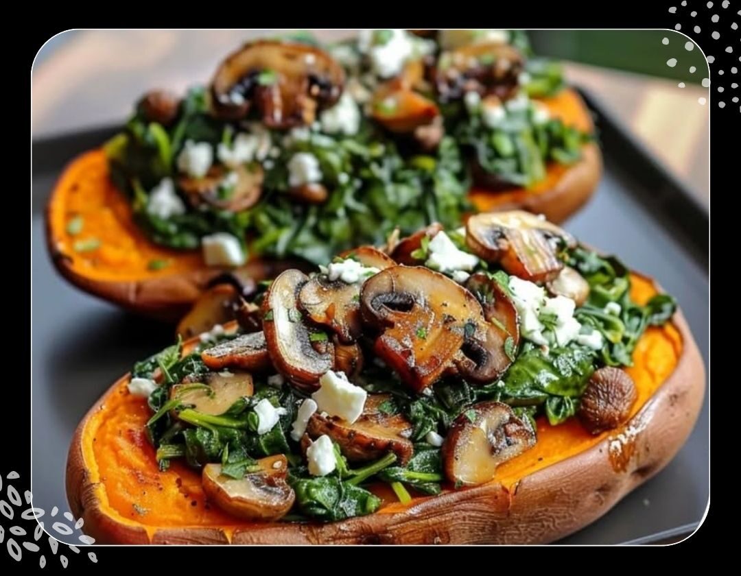 Mit der Spinat-Champignon-Mischung füllen, Feta darüberstreuen und mit der Knoblauch-Tahini-Sauce beträufeln.