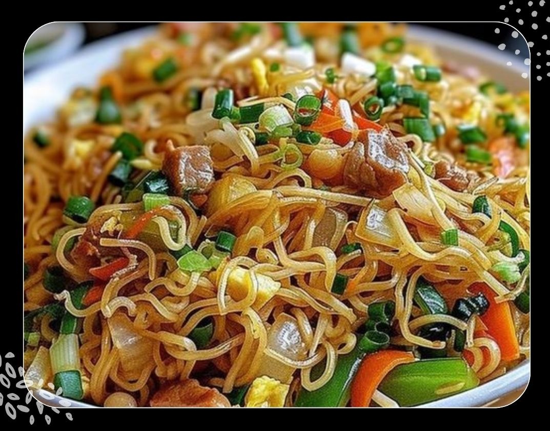 6- Die gebratenen Hähnchenwürfel und die gekochten Spaghetti hinzufügen und gut vermischen. Mit Sojasauce und Sesamöl beträufeln und alles gut vermischen. Weitere 2-3 Minuten braten, bis alles gut erhitzt ist.