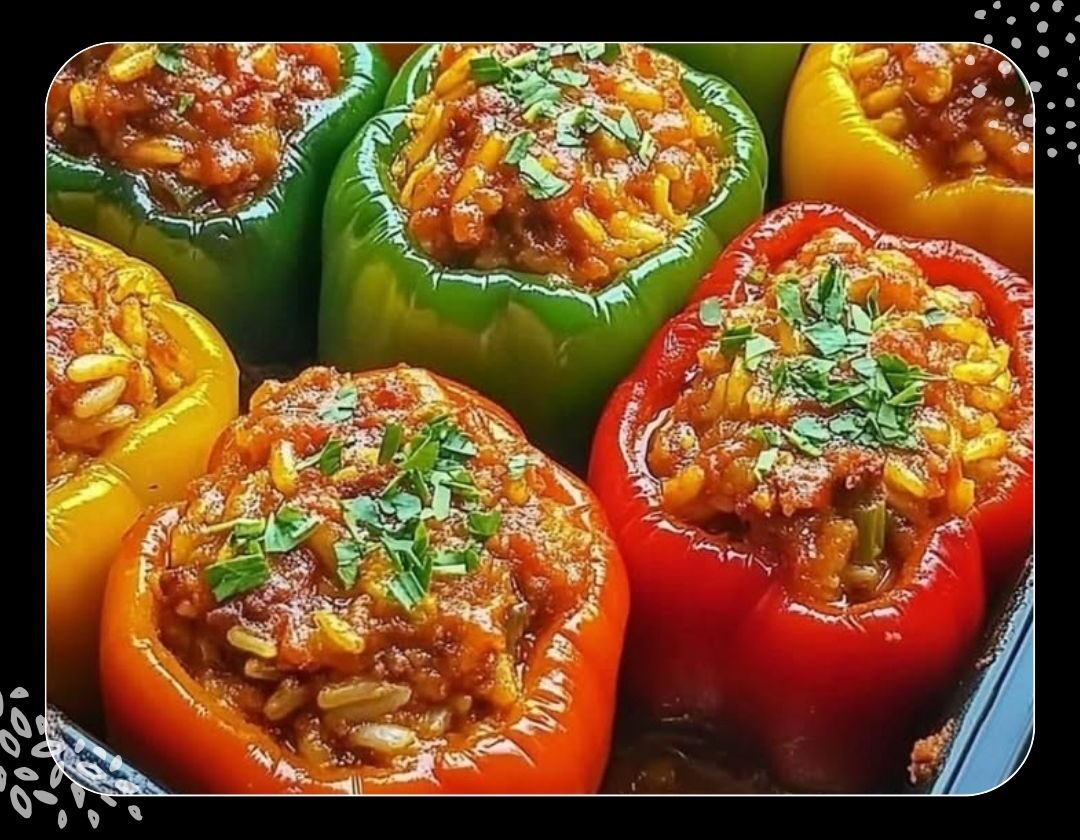 9- Die Form in den vorgeheizten Ofen bei 180 °C (Ober-/Unterhitze) stellen und die Paprika ca. 25–30 Minuten backen, bis der Käse goldbraun ist.