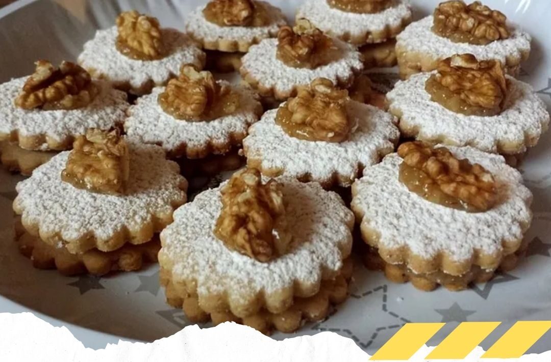 Nun die Plätzchen mit Puderzucker bestäuben. Je eine halbierte Nuss mit der übrigen Füllung auf die Plätzchen kleben.