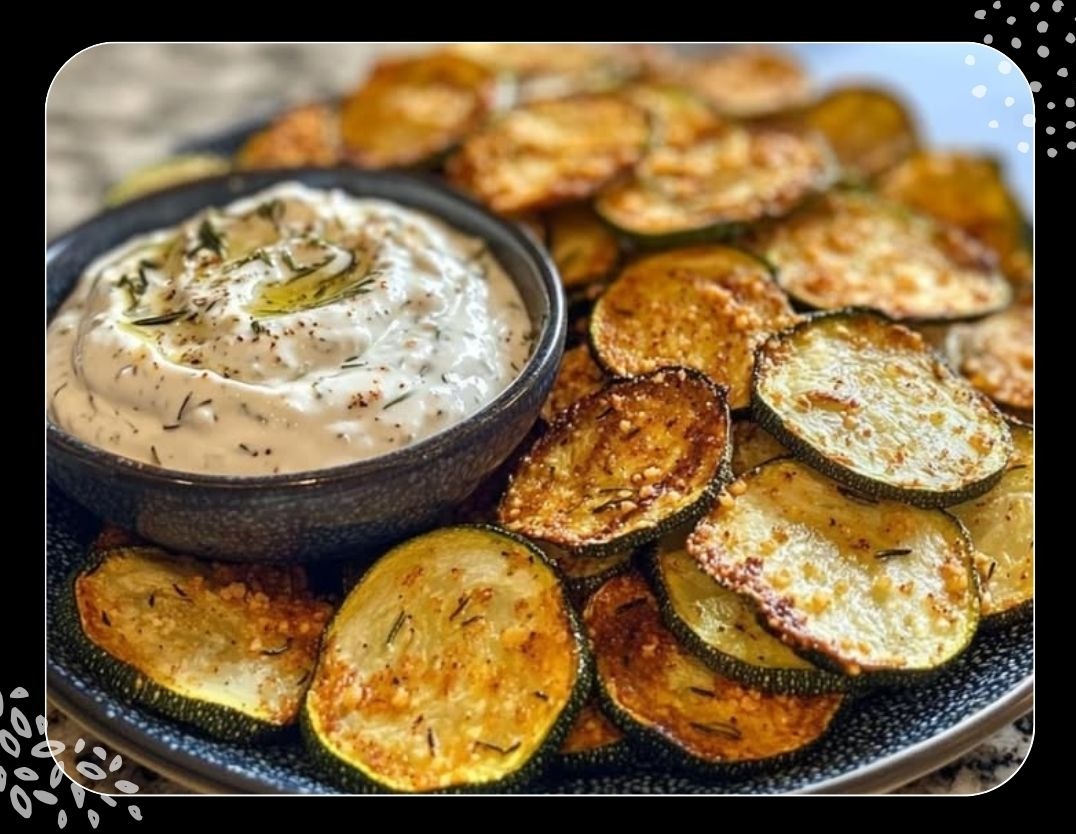 6- Die Zucchini-Chips auf einem Teller anrichten und mit der Rosmarin-Aioli servieren.