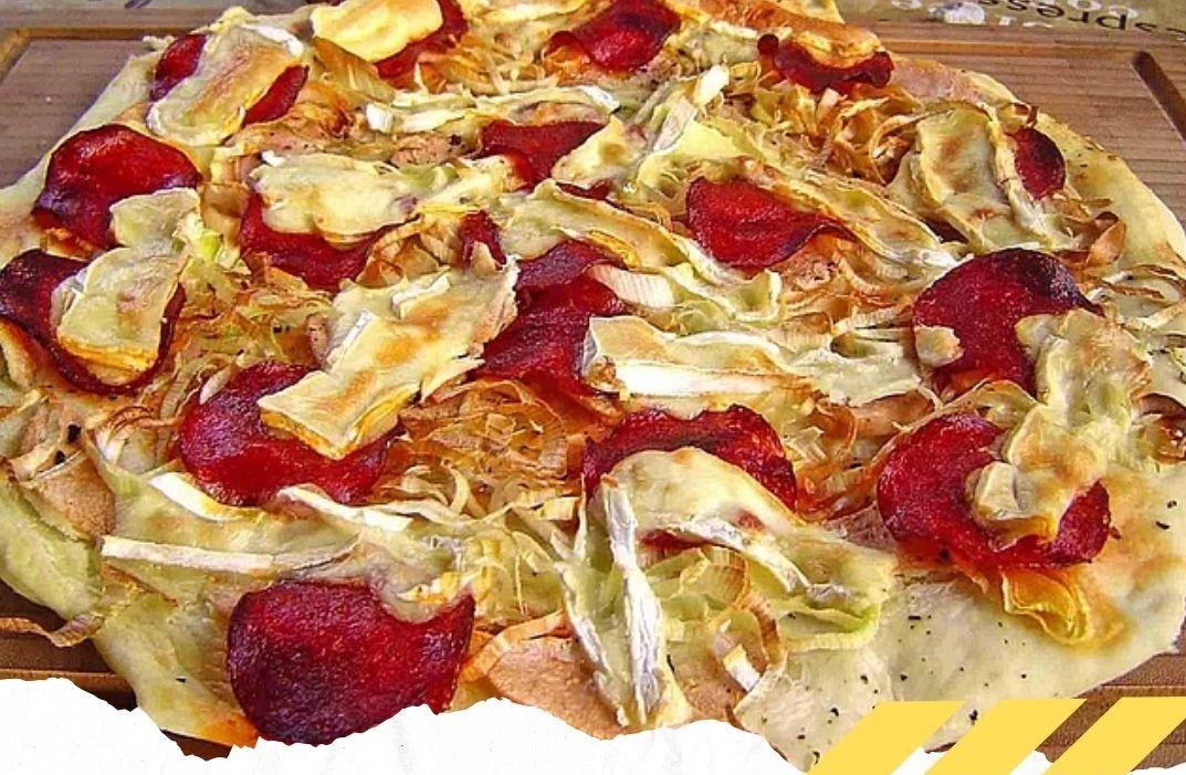 Pizzen herausnehmen, Lauchringe, Salami und in Scheiben geschnittenen Camembert darauf verteilen. Mit Fleur de Sel und Pfeffer würzen und weitere 10 Minuten backen.