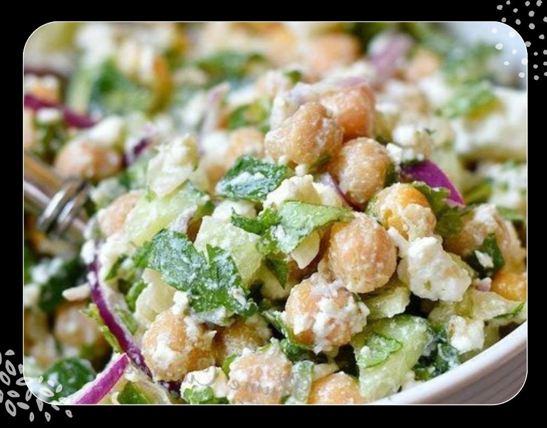 2- Gurke (optional geschält) und Zwiebel fein würfeln und zu den Kichererbsen geben.