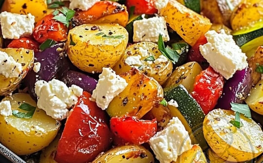6- Zerbröckelten Feta-Käse und frische Kräuter über das Gemüse und die Kartoffeln streuen. Weitere 5 Minuten im Ofen lassen, bis der Feta goldbraun ist.