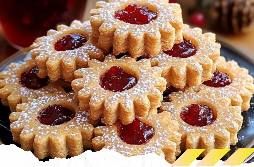 5. Die ganzen Plätzchen mit Himbeermarmelade bestreichen und die gelochten Plätzchen daraufsetzen. Mit Puderzucker bestäuben.