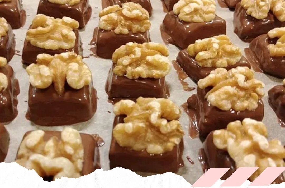 Die Marzipanrohmasse mit den gehackten Walnüssen und dem Rum verkneten. Die Masse etwa 1 cm dick ausrollen und 2 x 3 cm große trapezförmige Stücke ausschneiden.
