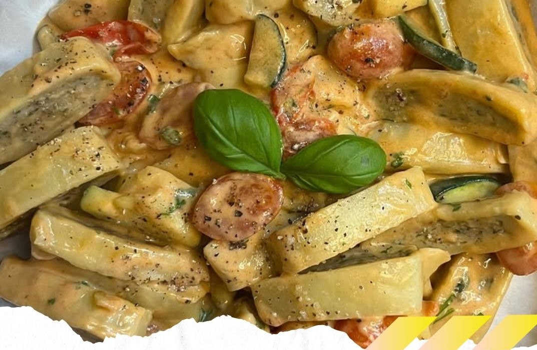 – Zucchini, Tomaten und Knoblauch zu den Maultaschen geben und mit anbraten.