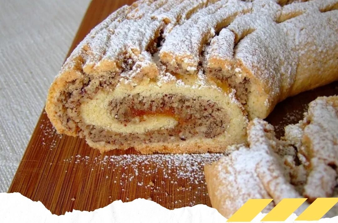 Den Teig dünn viereckig ausrollen, mit der Füllung bestreichen und zusammenrollen. Die Oberfläche sollte leicht eingeschnitten werden, damit sie nicht an den Seiten aufreißt beim Backen.