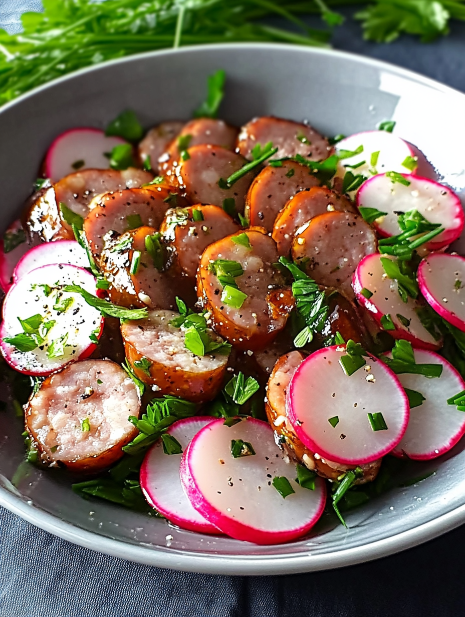 Im Gegensatz zu klassischen Blattsalaten liegt hier der Fokus auf deftigem Geschmack. Die Bratwürstchen sorgen für ein kräftiges Aroma, während Radieschen und Schnittlauch Frische und leichte Schärfe hinzufügen.