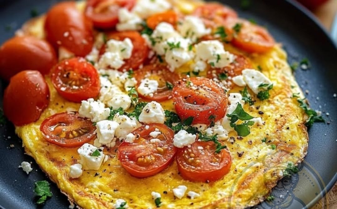 4- Wenn das Omelett fast vollständig gestockt ist, die Tomatenscheiben und den Feta gleichmäßig auf einer Hälfte verteilen.