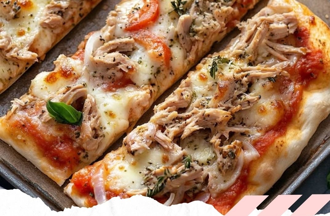 6- Den Reibekäse über die Sauce streuen. Zwiebel schälen, halbieren und in feine Streifen schneiden. Thunfisch abgießen und zusammen mit den Zwiebelstreifen auf der Pizza verteilen.