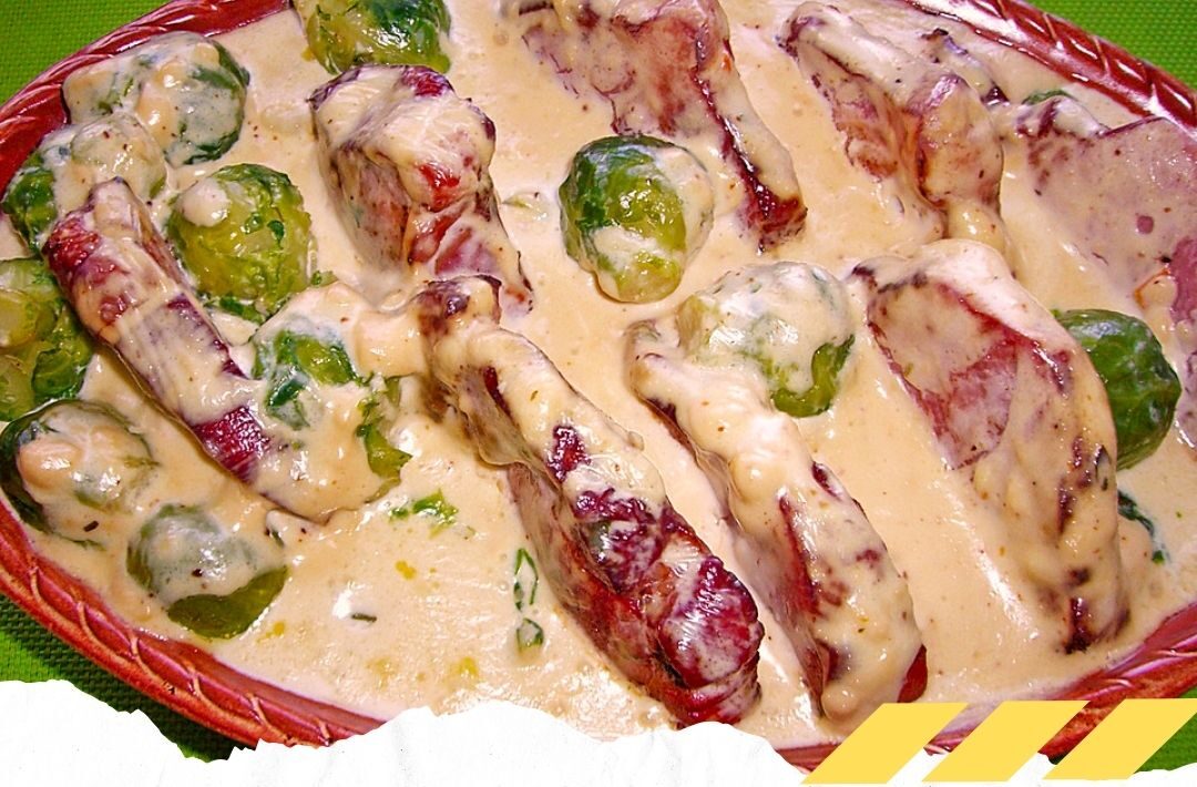 Den Rosenkohl putzen und kurz in leicht gesalzenem Wasser vorgaren. Das Kasseler in etwas Butterschmalz leicht anbraten, dann aus der Pfanne nehmen.