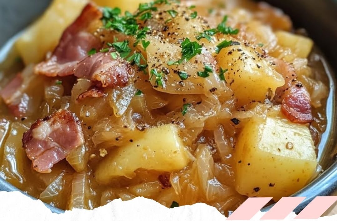 – Die gewürfelten Zwiebeln zum Speck geben und alles zusammen anbraten, bis die Zwiebeln glasig sind.