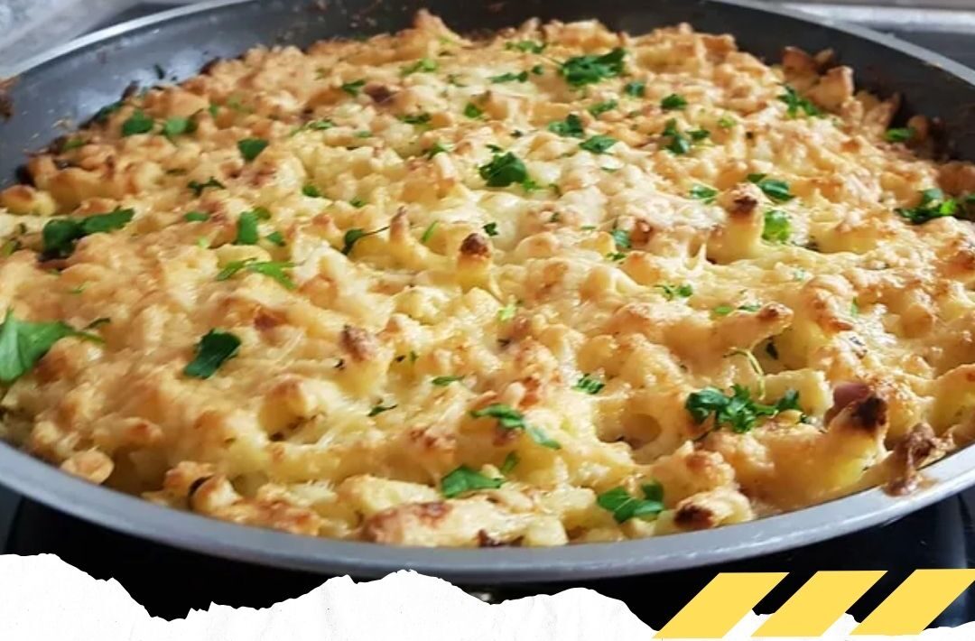 Die Mischung in eine gefettete Auflaufform geben und mit dem restlichen Käse bestreuen.