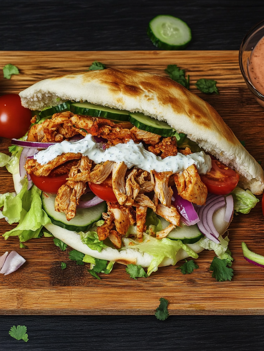 Hähnchen, Gemüse und Sauce in die Fladenbrote füllen und servieren.