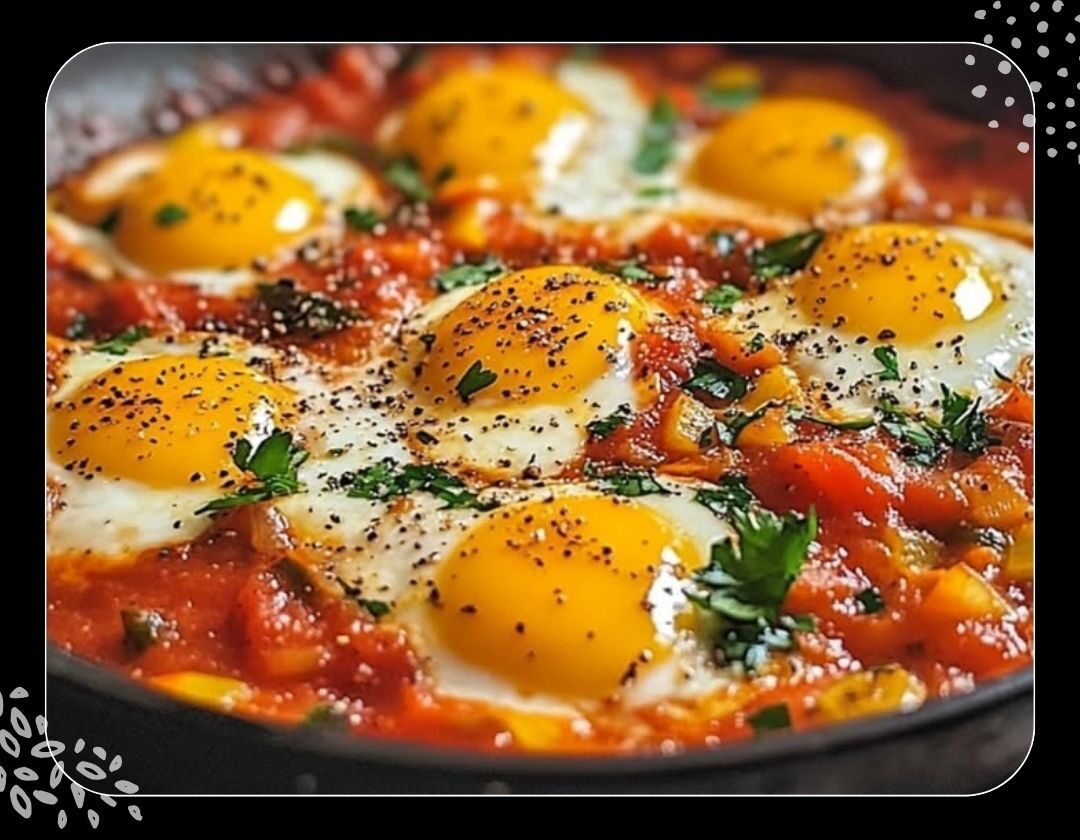 5- Die Eier gleichmäßig auf dem Tomatengemüse verteilen. Eiweiß mit einer Gabel leicht auflockern und 1–2 Minuten stocken lassen.