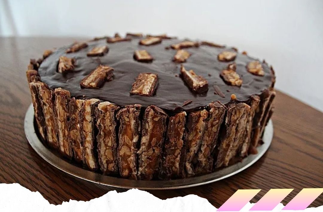 5. Die Kuvertüre schmelzen und über den Kuchen gießen. Mit den klein gewürfelten Snickers dekorieren.