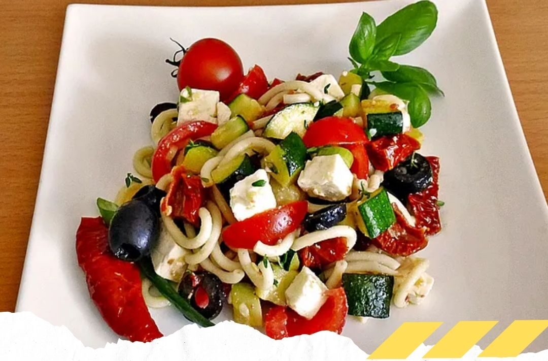 4. In einer großen Schüssel die abgekühlten Nudeln, Tomaten, Gurke, Feta-Käse, Oliven und Zwiebel vermengen.