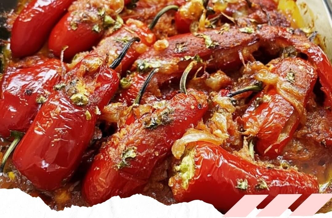 2- Die Paprikaschoten mit in längliche Streifen geschnittenem Schafskäse füllen und in eine leicht gefettete Auflaufform legen.
