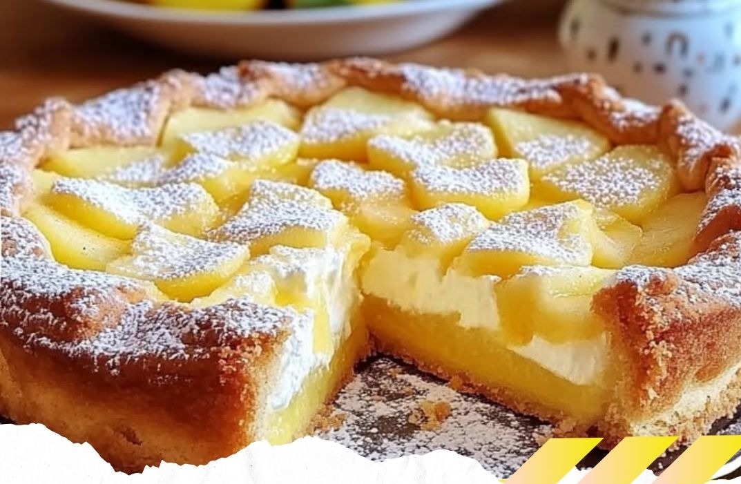 5- Den Teigboden mehrfach mit einer Gabel einstechen, mit den Apfelscheiben belegen und die Käsemasse gleichmäßig darüber verteilen.