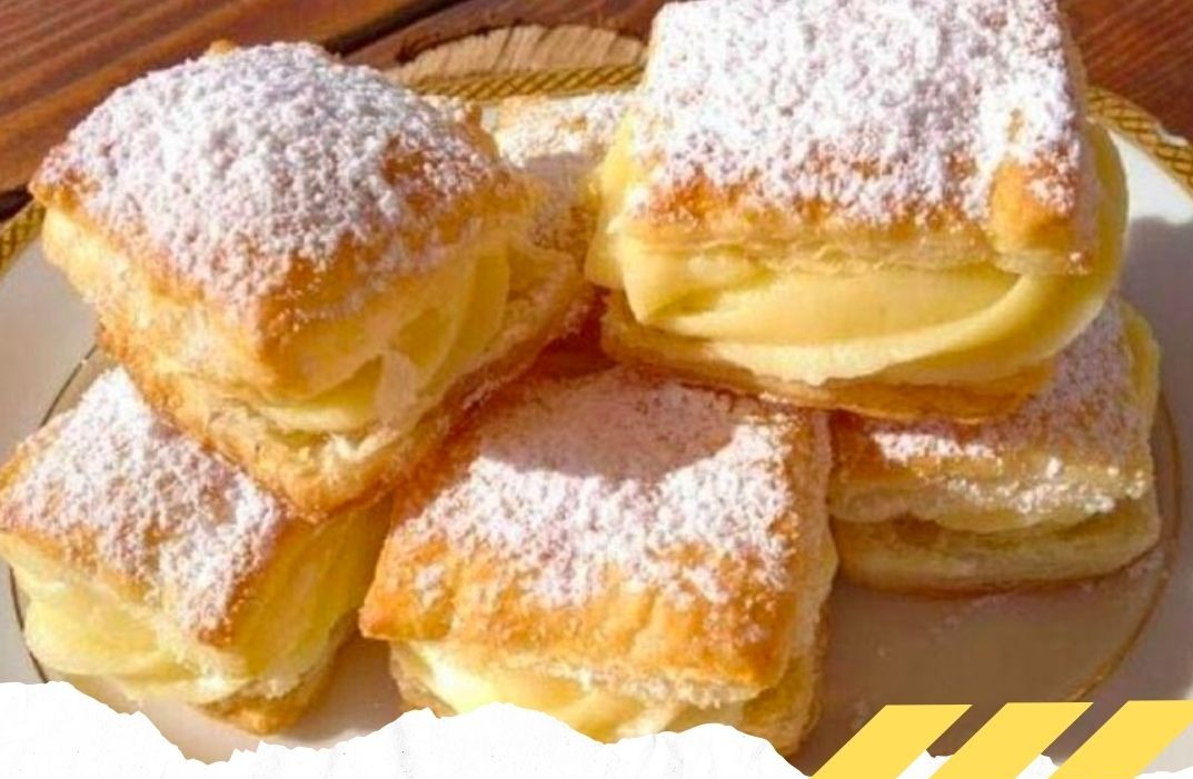 Den Blätterteig in Quadrate schneiden und im vorgeheizten Backofen bei 180 °C etwa 15 Minuten backen, bis er goldbraun ist. Anschließend etwas abkühlen lassen und dann in der Mitte durchschneiden.